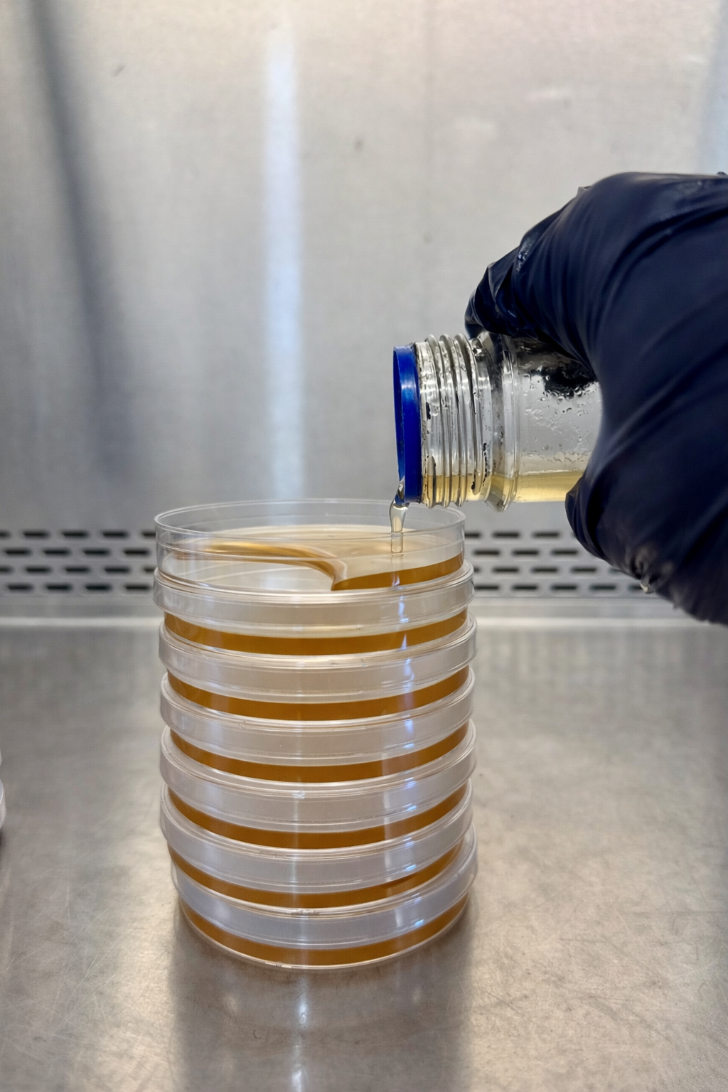 - You may also remove the Petri Dishes individually from the stack and pour, but the above method minimizes contam risk